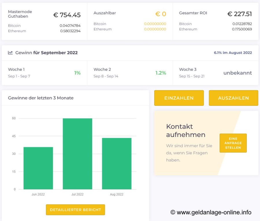 Der Gewinn liegt monatlich zwischen 5 und 15 %, er kann jeden Monat ausgezahlt, aber auch automatisch wieder Reinvestiert werden. Wie viel Prozent ausgezahlt oder wieder investiert wird, kannst du selber entscheiden und einstellen.